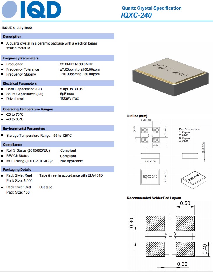 IQD晶振頻率產(chǎn)品公司提供世界上最小的石英晶體IQXC-240,尺寸僅為1.2x1.0mm毫米,四腳貼片晶振,高度僅為0.33毫米。IQXC-240無源晶振的頻率范圍為36MHz至80MHz,在-20至70°C的商用溫度范圍內(nèi),頻率穩(wěn)定性可低至10ppm,在-40至85°C的工業(yè)溫度范圍內(nèi),頻率穩(wěn)定性可低至15ppm,頻率容差可低至7ppm。該貼片石英晶振符合最新一代微處理器的要求,負(fù)載電容可低至5pF。封裝在帶有電子束密封金屬蓋的4焊盤陶瓷密封封裝中,有助于將EMI輻射降至最低。根據(jù)IEC 60068-2-27標(biāo)準(zhǔn),該產(chǎn)品能夠承受高達(dá)1000G的沖擊。根據(jù)EIA-481D,IQXC-240可提供磁帶和卷軸。超小型石英晶體IQXC-240非常適合物聯(lián)網(wǎng)應(yīng)用、VGA、USB和Wi-Fi等空間寶貴的應(yīng)用。