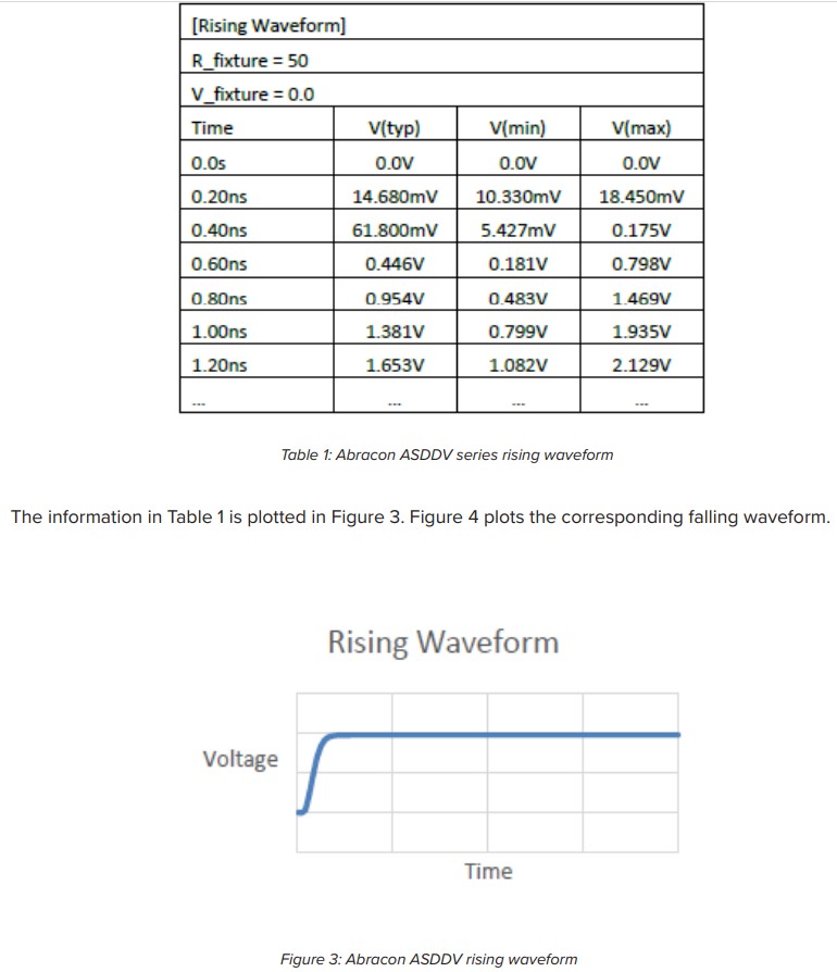 用戶可以檢查振蕩器產品結構模型的內部情況。IBIS模型, 然而,是行為模型,這意味著它們記錄電流、電壓和 稍后在模擬電路中重復的時間。這使得振蕩器的性能 整合到一個更大的系統的設計中,而不透露 振蕩器本身。表1是IBIS摘錄,顯示了Abracon石英晶振ASDDV的上升輸出波形系列CMOS振蕩器。