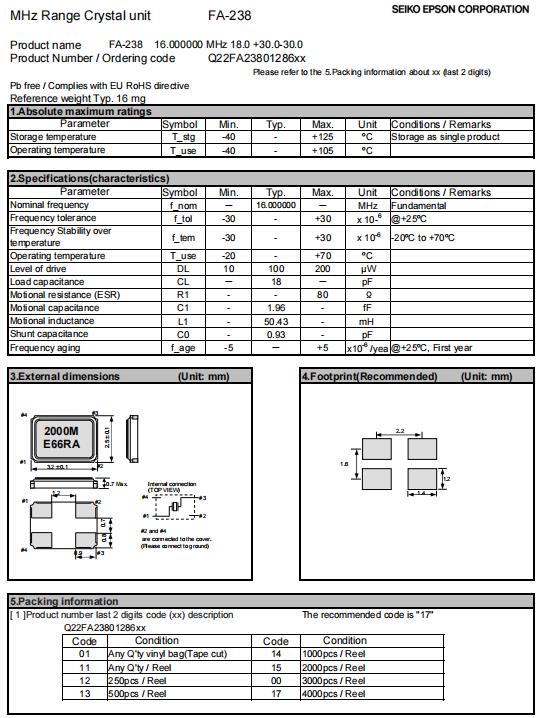 | Q22FA2380128616 | 3.2 x 2.5 x 0.7mm | FA-238 | 16.000000 MHz | 18 pF | +/-30 ppm | +/-30 ppm | -20 to +70 °C | ≤ 80 Ω |