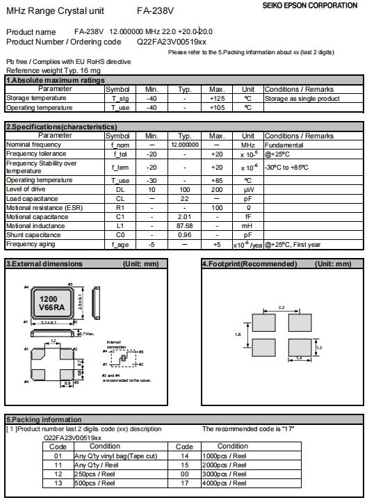 | Q22FA23V0051916 | 3.2 x 2.5 x 0.7mm | FA-238V | 12.000000 MHz | 22 pF | +/-20 ppm | +/-20 ppm | -30 to +85 °C | ≤ 100 Ω |