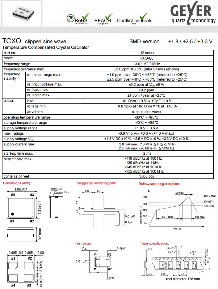Geyer格耶晶振推出KXO-88-TCXO系列的又一款小型化產品,KXO-88小體積晶振尺寸僅為1.6x1.2mm,四腳貼片晶振,有源晶振,TCXO溫補晶振,石英晶體振蕩器,石英晶振,電源電壓:1.8V,2.5V,3.3V。具有超小型,輕薄型,低抖動,低功耗,低電源電壓,低耗能,低損耗,低電平,低相位噪聲等特點,非常適合低功耗物聯網應用。這是TCXO領域的另一個小型化,并在移動通信技術中得到應用,例如WLAN、ISM、NFT、無線模塊、物聯網領域和許多其他領域。6G有源晶振KXO-88-TCXO非常適合低功耗物聯網應用