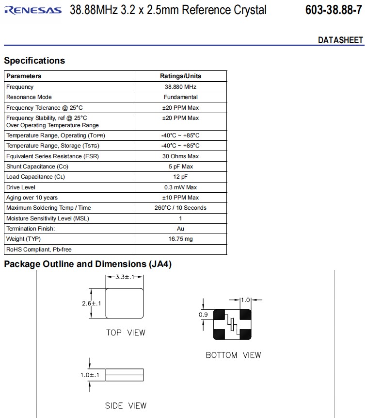 Renesas進口晶振,603-38.88-7JA4I,醫療設備6G晶振,參數表
