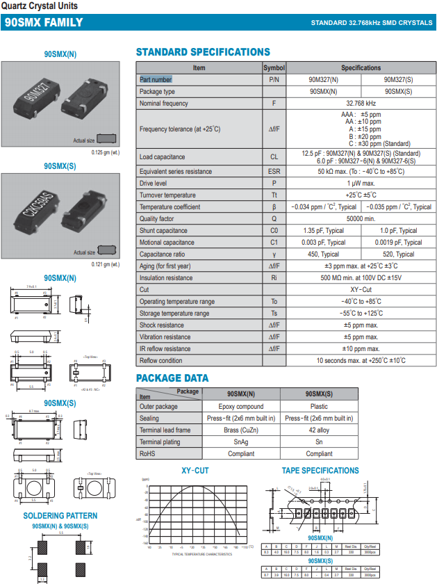SMI晶體,千赫茲石英晶體,90SMX(N)諧振器.該類產品特性如耐熱性,耐沖擊性,在辦公自動化,家電相關電器領域及Bluetooth,Wireless LAN等短距離無線通信領域可發(fā)揮優(yōu)良的電氣特性,滿足無鉛焊接的回流溫度曲線要求.