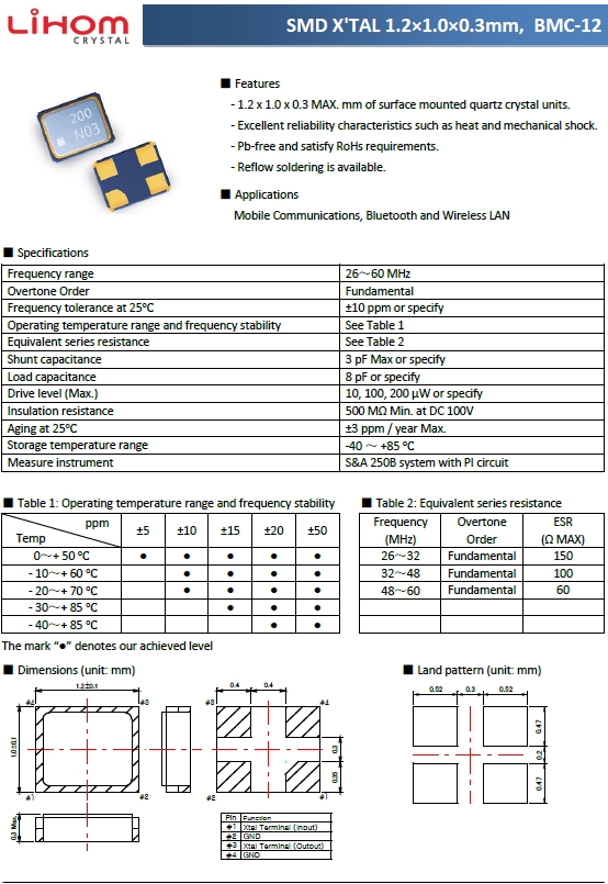 Lihom晶體,Lihom Crystal,BMC-12石英振動子.小型表面貼片型貼片晶振,較適合使用在數碼家電領域中,也是特別要求高可靠性的引擎控制用CPU的時鐘部分.低頻晶振可從26MHz起對應,小型,薄型具備強防焊裂性,