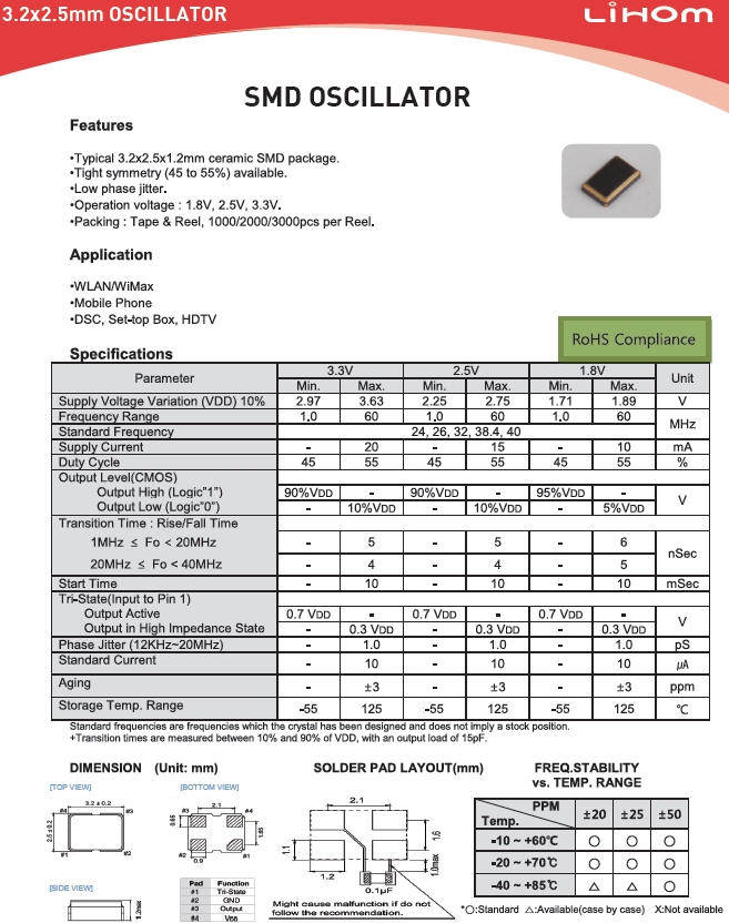 Lihom晶振,貼片晶振,BMS-253R有源晶振.小型貼片石英晶振,外觀尺寸具有薄型表面貼片型石英晶體振蕩器,特別適用于有小型化要求的市場領域,比如智能手機,無線藍牙,平板電腦等電子數碼產品.晶振本身小型,薄型,重量輕,晶體具有優良的耐環境特性,如耐熱性,耐沖擊性,