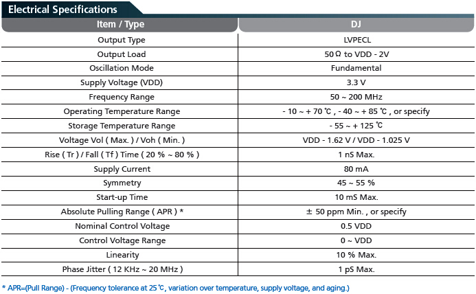 DJ,DR,3225mm有源晶振,壓控晶體振蕩器,TXC石英晶振,壓控晶體振蕩器(VCXO),基本解決方案,LVPECL輸出,輸出頻率50兆赫到200兆赫.優秀的低相位噪聲和抖動,可用三態函數,應用程序:SDH / SONET、以太網、基站,通過無鉛認證/ Pb免費.