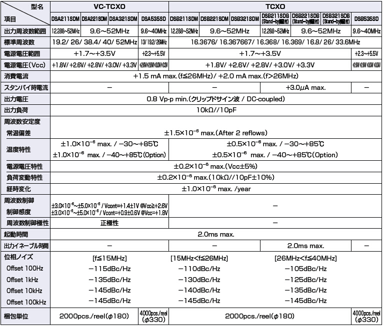 DSA211SDM(VC-TCXO)石英晶振,DSB211SDM(TCXO)有源晶振,“1XXC52000JBA”大真空株式會社,SMD封裝2.0*1.6*0.63mm,頻率范圍12.288MHz~52.0MHz,低電壓1.7V~3.5V,頻率溫度穩定值±1.5×10-6,VC-TCXO產品內部晶片焊接模式采用了,高精密點膠技術:晶片膠點的位置、大小:位置準確度以及膠點大小一致性,通過圖像識別及高精密度數字定位系統的運用、使晶片的點膠的精度在±0.02mm之內.