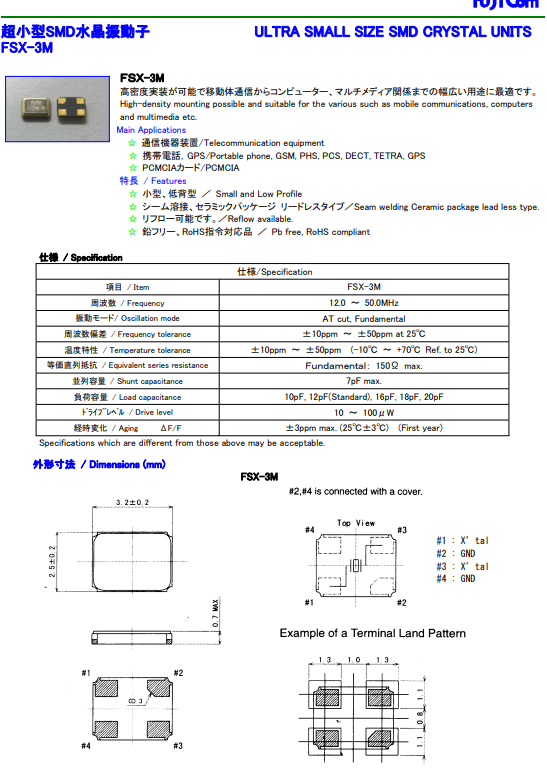 富士晶振,Quartz crystal,FSX-3M石英晶體諧振器.小型表面貼片型貼片晶振,較適合使用在汽車電子領域中,也是特別要求高可靠性的引擎控制用CPU的時鐘部分.低頻晶振可從12MHz起對應,小型,薄型具備強防焊裂性,石英晶體在惡劣嚴酷的環境條件下也能發揮穩定的起振特性,產品本身具有耐熱,耐振,耐撞擊等優良的耐環境特性,滿足無鉛焊盤以及高溫回流溫度曲線要求,符合AEC-Q200認證.