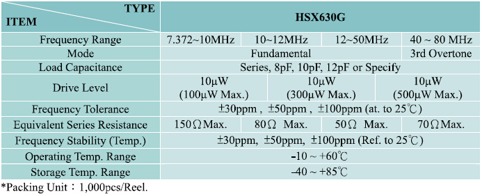 HSX630G諧振器,6035mm陶瓷面晶振,加高晶振型號,尺寸大小6.0*3.5*1.2mm,頻率范圍7.372 to 80.0MHZ,工作溫度-10~+60℃耐高溫環境,精度高和可靠性的熱量阻力,適合各種應用程序,常見臨時轉換解決方案便攜式消費設備,選擇性浸式時鐘臨時解決方案,設計要考慮切換到SMD類型生產.