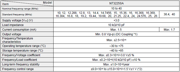 NT3225SA溫補晶振,NDK石英晶體振蕩器,GPS導航儀晶振,為對應低電源電壓的產品(可對應 DC+1.7 V to +3.3 V.),高度:最高1.0 mm、體積:0.007 cm3、重量:0.024 g,小型、量輕,帶有AFC(頻率控制)功能,低消耗電流,表面貼片型產品(可對應回流焊),無鉛產品,滿足無鉛焊接的回流溫度曲線要求.