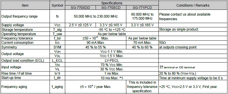 SG-770SDD,SCD振蕩器,家用空調晶振,EPSON石英晶振,頻率范圍50MHz~230MHz,“SG-770SDD 150.0000ML3”電源電壓2.5V 或 3.3V,輸出微分LV-PECL,外部尺寸規格7.0×5.0×1.6mm,特性帶HFF-XTAL的基頻振蕩器,功能待機(ST).被廣泛應用到各種小巧的便攜式消費電子數碼時間產品,環保性能符合ROHS/無鉛標準.