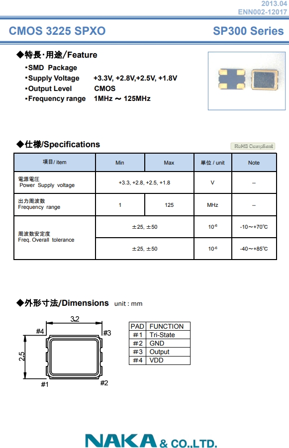 NAKA晶體,石英晶振,SP300石英晶體振蕩器.小型表面貼片型貼片晶振,較適合使用在汽車電子領域中,也是特別要求高可靠性的引擎控制用CPU的時鐘部分.低頻晶振可從7.98MHz起對應,小型,薄型具備強防焊裂性,NAKA Crystal在惡劣嚴酷的環境條件下也能發揮穩定的起振特性,產品本身具有耐熱,耐振,耐撞擊等優良的耐環境特性,滿足無鉛焊盤以及高溫回流溫度曲線要求,符合AEC-Q200認證.