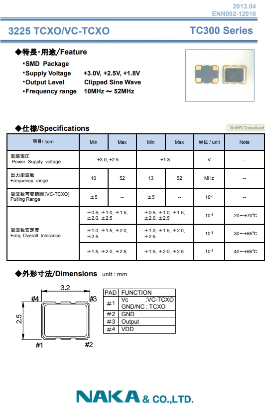 NAKA晶體,TCXO晶振,TC300石英晶體振蕩器.小型表面貼片型貼片晶振,較適合使用在汽車電子領域中,也是特別要求高可靠性的引擎控制用CPU的時鐘部分.低頻晶振可從7.98MHz起對應,小型,薄型具備強防焊裂性,NAKA Crystal在惡劣嚴酷的環境條件下也能發揮穩定的起振特性,產品本身具有耐熱,耐振,耐撞擊等優良的耐環境特性,滿足無鉛焊盤以及高溫回流溫度曲線要求,符合AEC-Q200認證.
