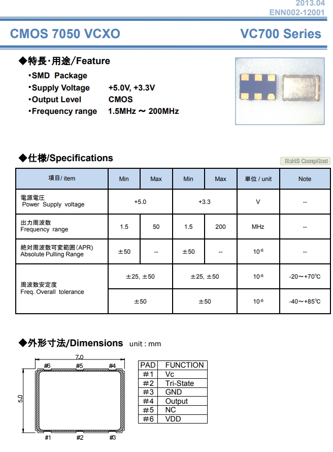 NAKA晶振,壓控晶振,VC700振蕩子.貼片石英晶體,體積小,焊接可采用自動貼片系統,產品本身小型,表面貼片晶振,特別適用于有小型化要求的電子數碼產品市場領域,因產品小型,薄型優勢,耐環境特性,包括耐高溫,耐沖擊性等