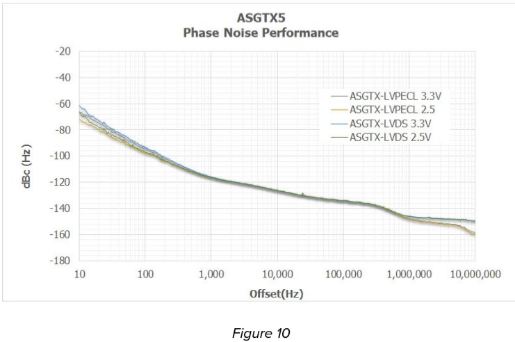 圖10總結了具有LVPECL和LVDS輸出格式的ASGTX5 TCXO晶振[5.0 x 3.2 x 1.5 mm]器件在所有可用Vdd電平下的典型相位噪聲性能。