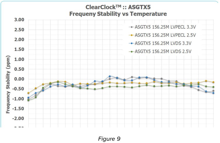 盡管規(guī)定了在-40以上±3.0 ppm的保證最大誤差?C至+85?C、 ASGTX5器件在這個擴展的工作溫度范圍內(nèi)通常保持優(yōu)于±1.0ppm的精度。下圖9概述了ASGTX5器件在156.25MHz載波下的溫度穩(wěn)定性性能。