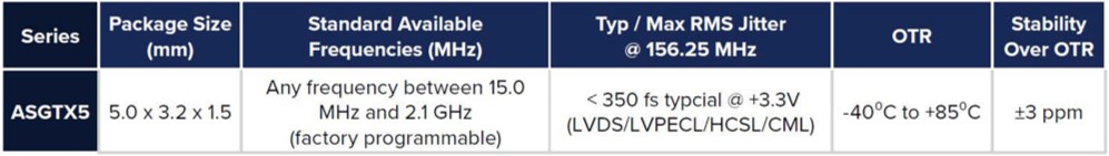 編碼ASGTX5PAD1-156.2500T2,ASGTX5系列采用5.0x3.2x1.8mm SMT封裝,超過了Stratum IV要求的±32 ppm全包穩(wěn)定性。即使有內(nèi)置的溫度補償,該系列設備在156.25MHz載波下也表現(xiàn)出典型的RMS抖動性能<350fs。此外,ASGTX5有四種標準差分輸出格式(LVDS、LVPECL或CML),載波頻率在15MHz和2.1GHz之間,HCSL格式最高可達700MHz。該系列非常適合需要嚴格頻率精度、高載波頻率[如1.00GHz]或CML差分輸出的系統(tǒng)。