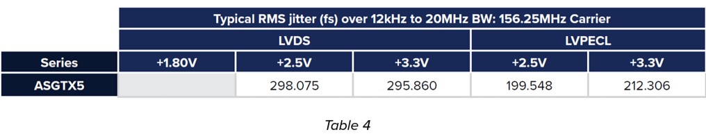 盡管ASGTX5是一種溫度補償解決方案,但Abracon已經(jīng)制定了特定的設計技術來保持卓越的RMS抖動性能,如下表4所示。