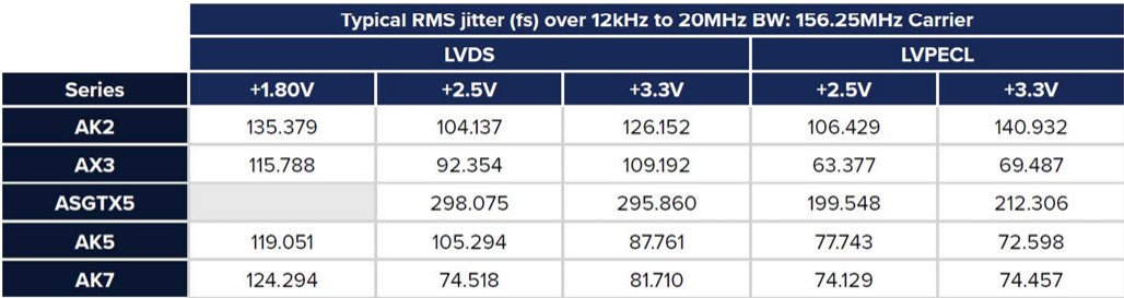 ASGTX5溫補晶體振蕩器(TCXO)解決方案在15.0MHz和2.1GHz之間的任何載波頻率下都能滿足這一嚴格要求。然而,為了實現(xiàn)這一精度,該解決方案的RMS抖動比其第三泛音ClearClock稍差™ 同行。例如,它在156.25MHz載波上表現(xiàn)出<350fs的典型RMS抖動。