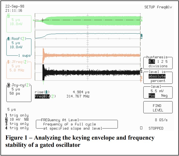 門控或鍵控振蕩器快速打開和關閉。 這種類型的操作通常導致頻率變化或 “唧唧喳喳”。對于帶有抖動和定時分析包的勒克羅伊示波器來說,表征門控石英晶體振蕩器的鍵控特性和頻率穩定性是一項簡單的工作。